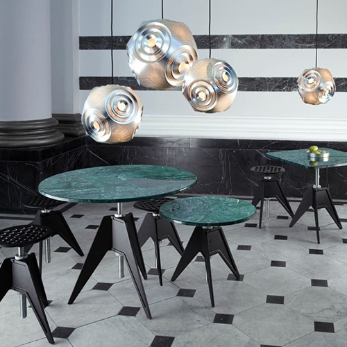 The Screw Table series by Tom Dixon is inspired by the materials and processes of the Industrial Revolution. It features a durable tripod base made from sand cast iron that's hand polished to create the black powder coated finish. An aluminum thread allows for easy height adjustments by simply spinning the top. The Screw Table series is available with two size marble tops and works for both indoor and outdoor use. Call for Pricing